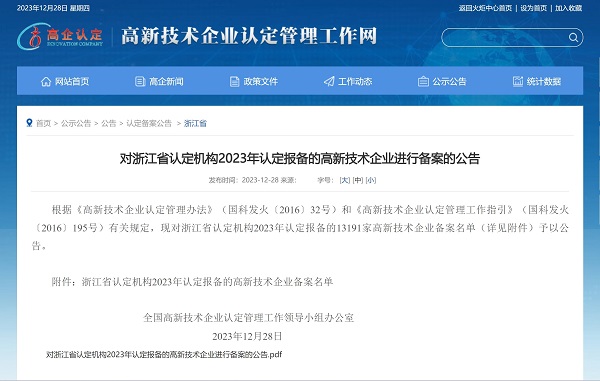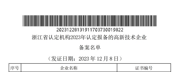 • 2023年12月28日,全國高新技術企業認定管理工作領導小組辦公室發布《對浙江省認定機構2023年認定報備的高新技術企業進行備案的公告》,中國能源工程集團有限公司(以下簡稱“中國能源工程集團”)所屬中清能源(杭州) 有限公司(以下簡稱“中清能源”)順利通過國家高新技術企業認定證書編號:GR202333007449